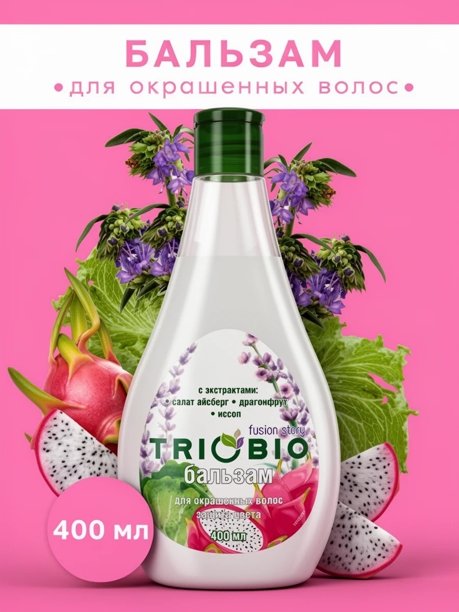 Бальзам для окрашенных волос, защита цвета с экстрактами салата айсберг, драгонфрута, иcсопа "TRIOBIO" 400 мл.