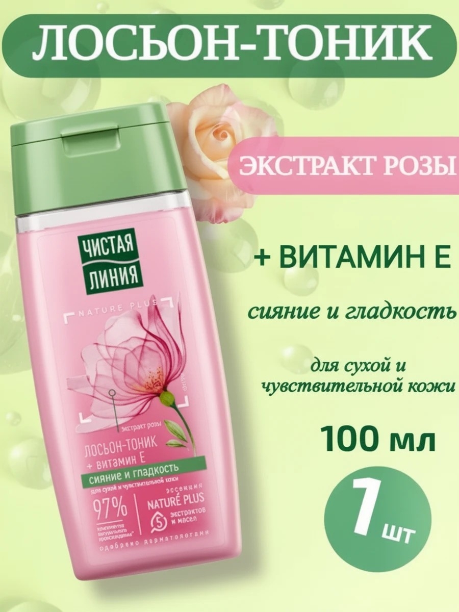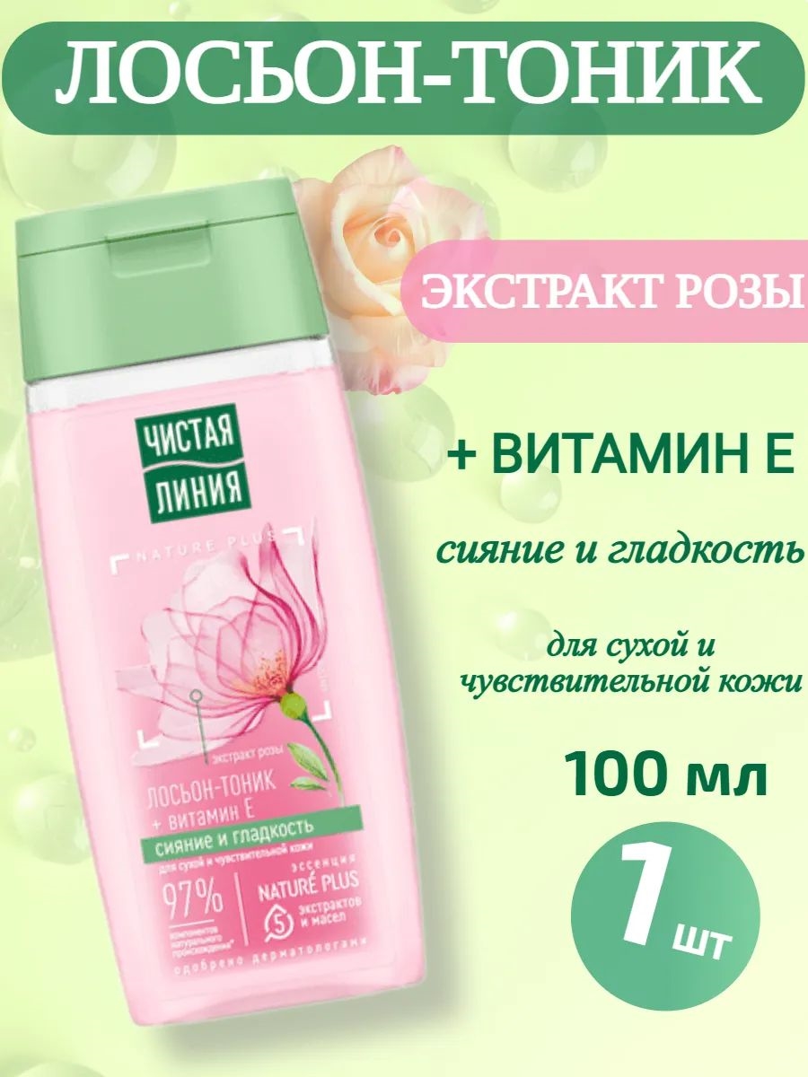 Чистая линия Лосьон-тоник Сияние и гладкость для сухой и чувствительной кожи с экстрактом розы и витамином Е, 100 мл