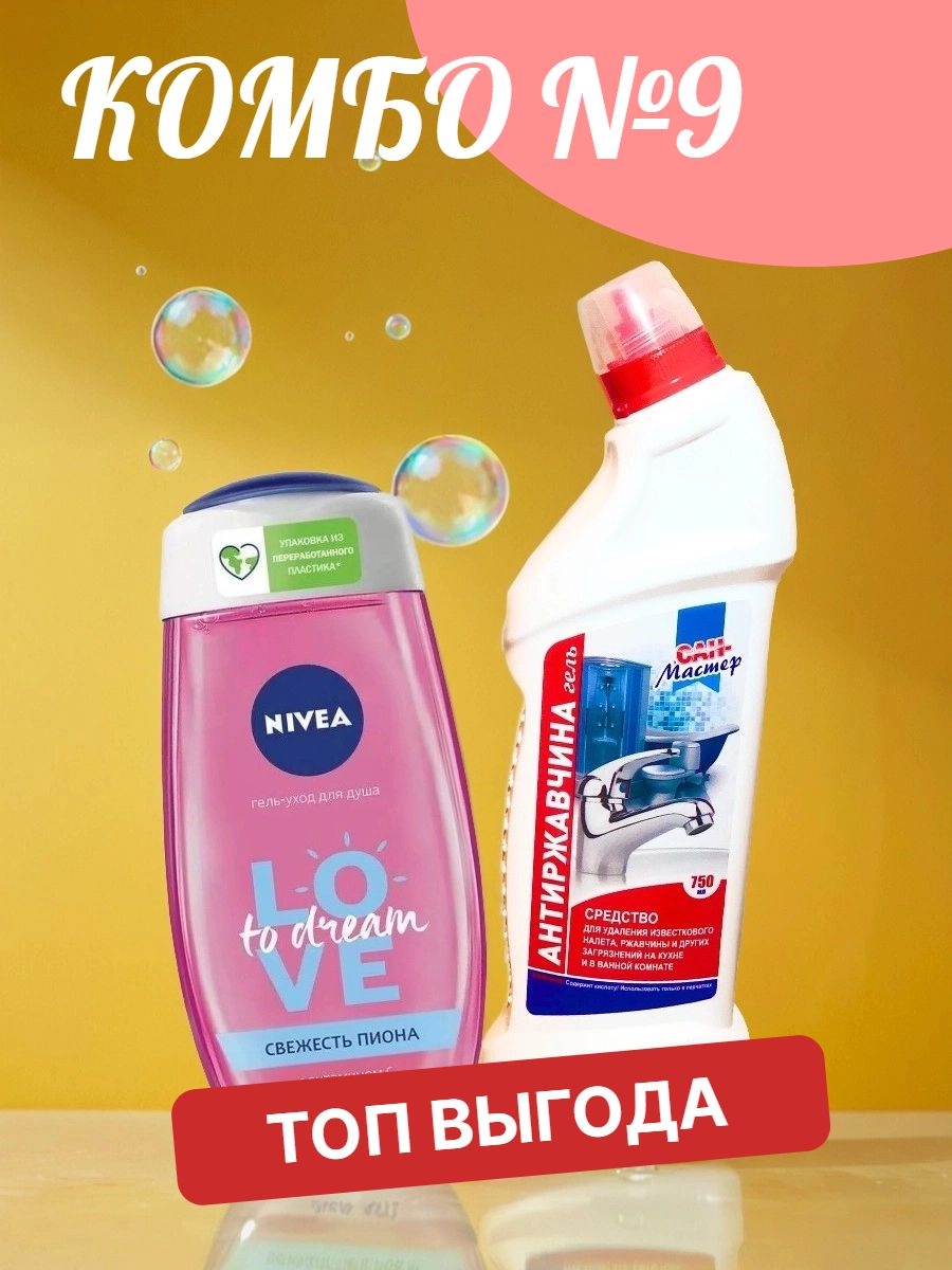 Комбо №9 Сан-Мастер АНТИРЖАВЧИНА 750 мл средство для удаления известкового налета, ржавчины & Гель для душа Nivea (Нивея) Свежесть пиона женский 250 мл.