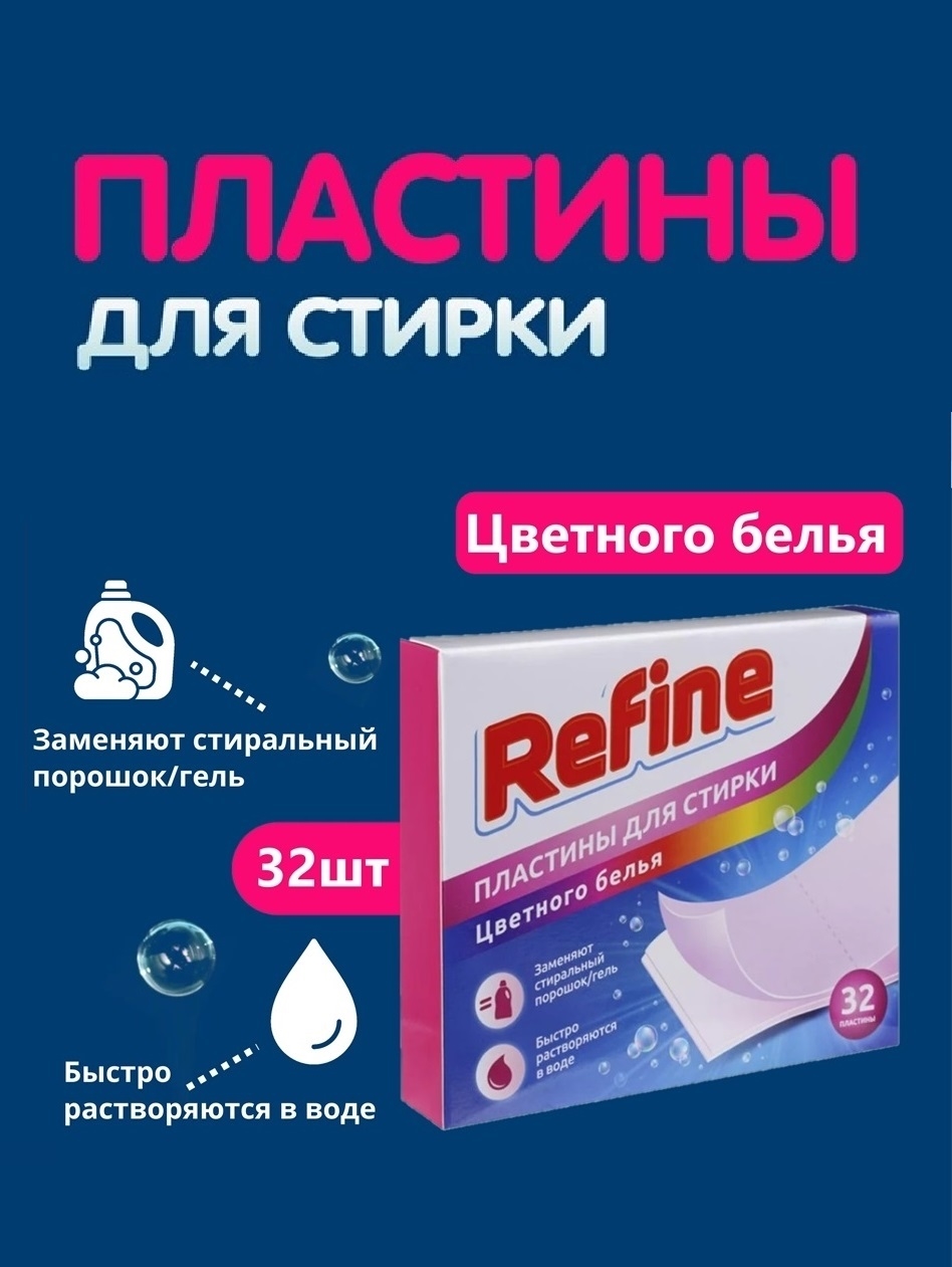 Пластины для стирки, Refine, заменяют стиральный порошок или гель. Быстро растворяются в воде, обеспечивая равномерное распределение средства. Занимают минимум места, исключают риск проливания, экономичны в использовании. Перед использованием ознакомьтесь с инструкцией и мерами предосторожности на упаковке. В упаковке 32 пластины.