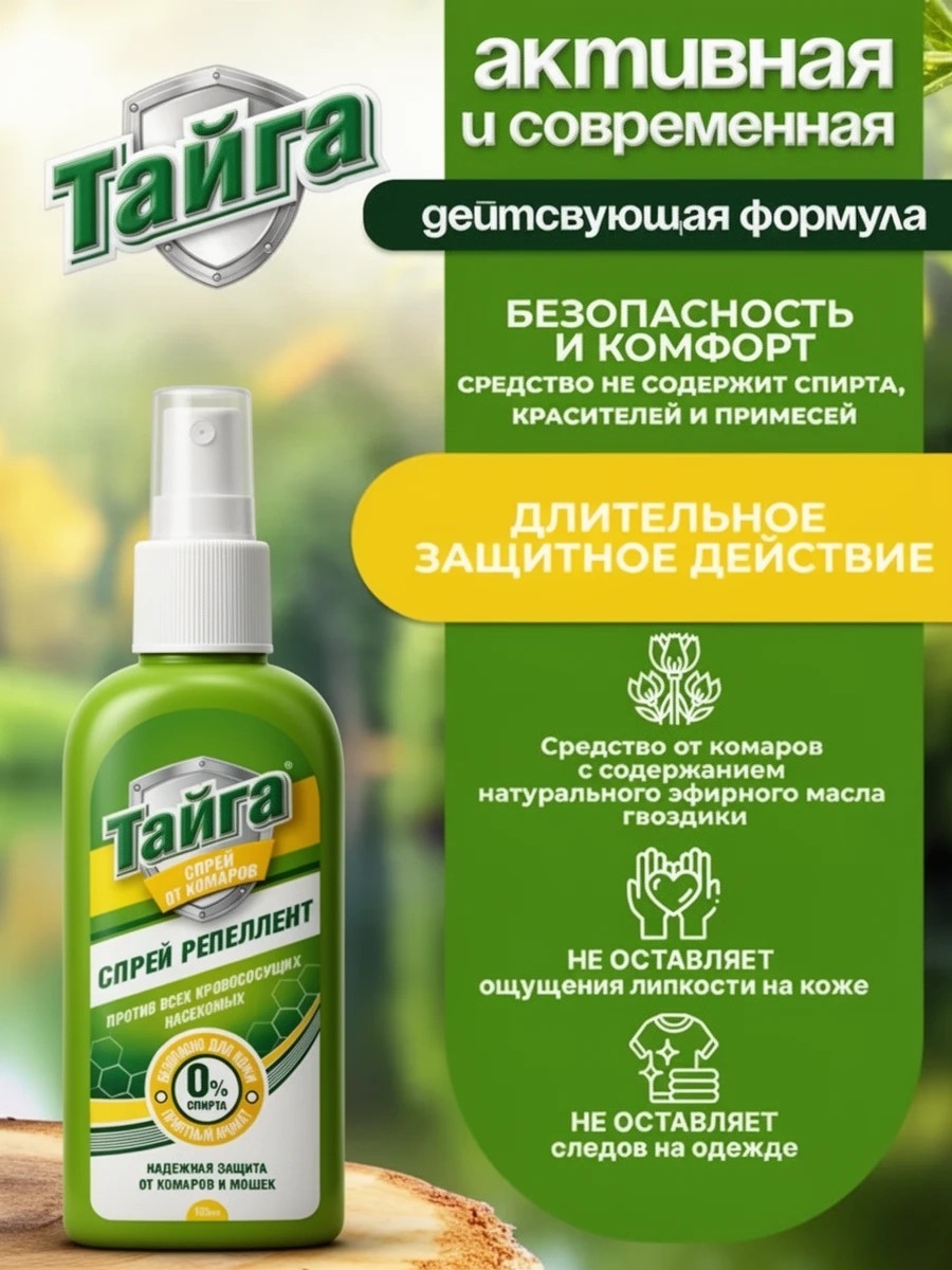 Средство репеллентное «Тайга» спрей с маслом гвоздики для защиты от комаров, мокрецов, москитов, слепней - это хорошо известное средство, которое прекрасно подойдет для всей семьи во время пикника на природе или летнего вечера на даче. Против всех кровососущих насекомых.